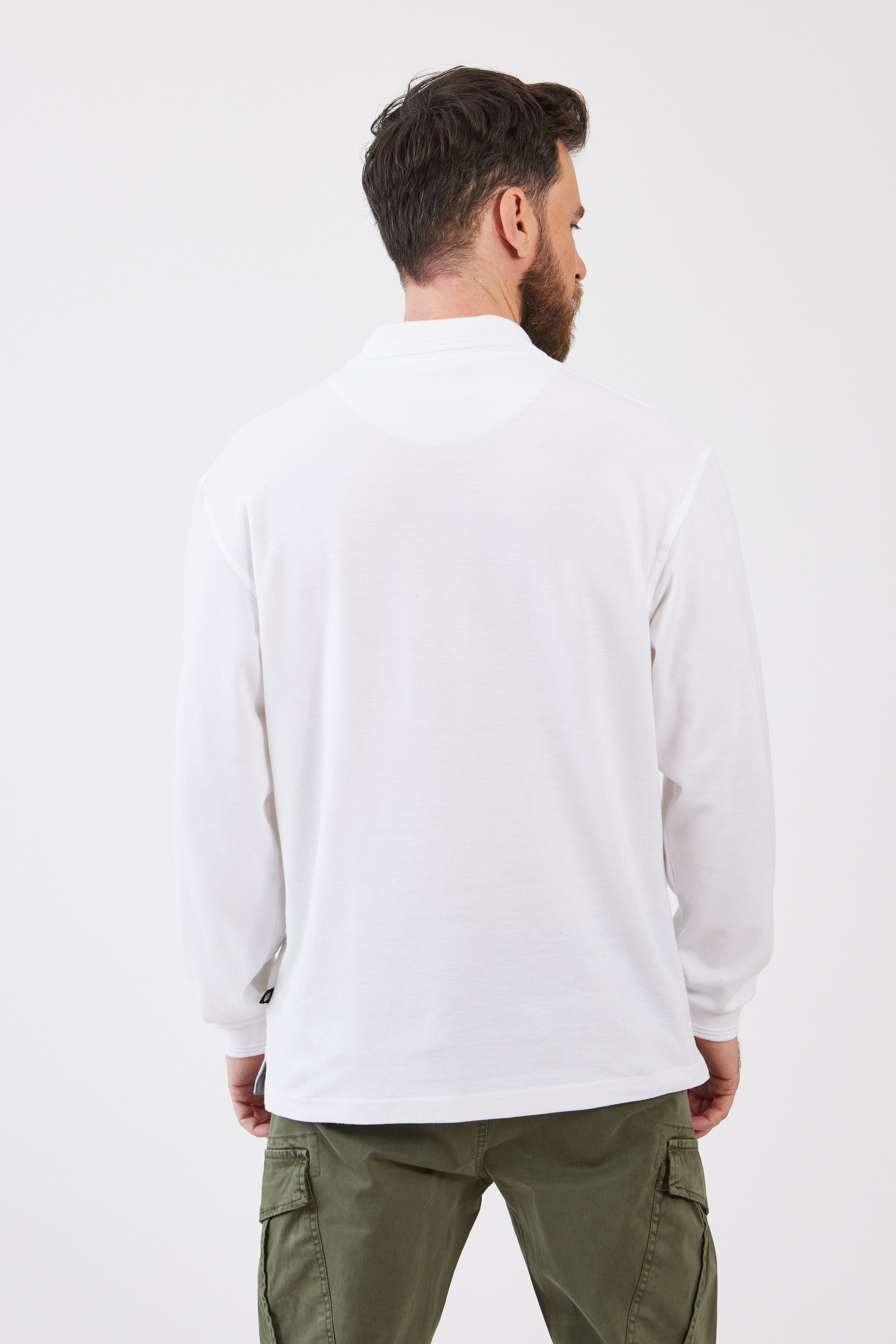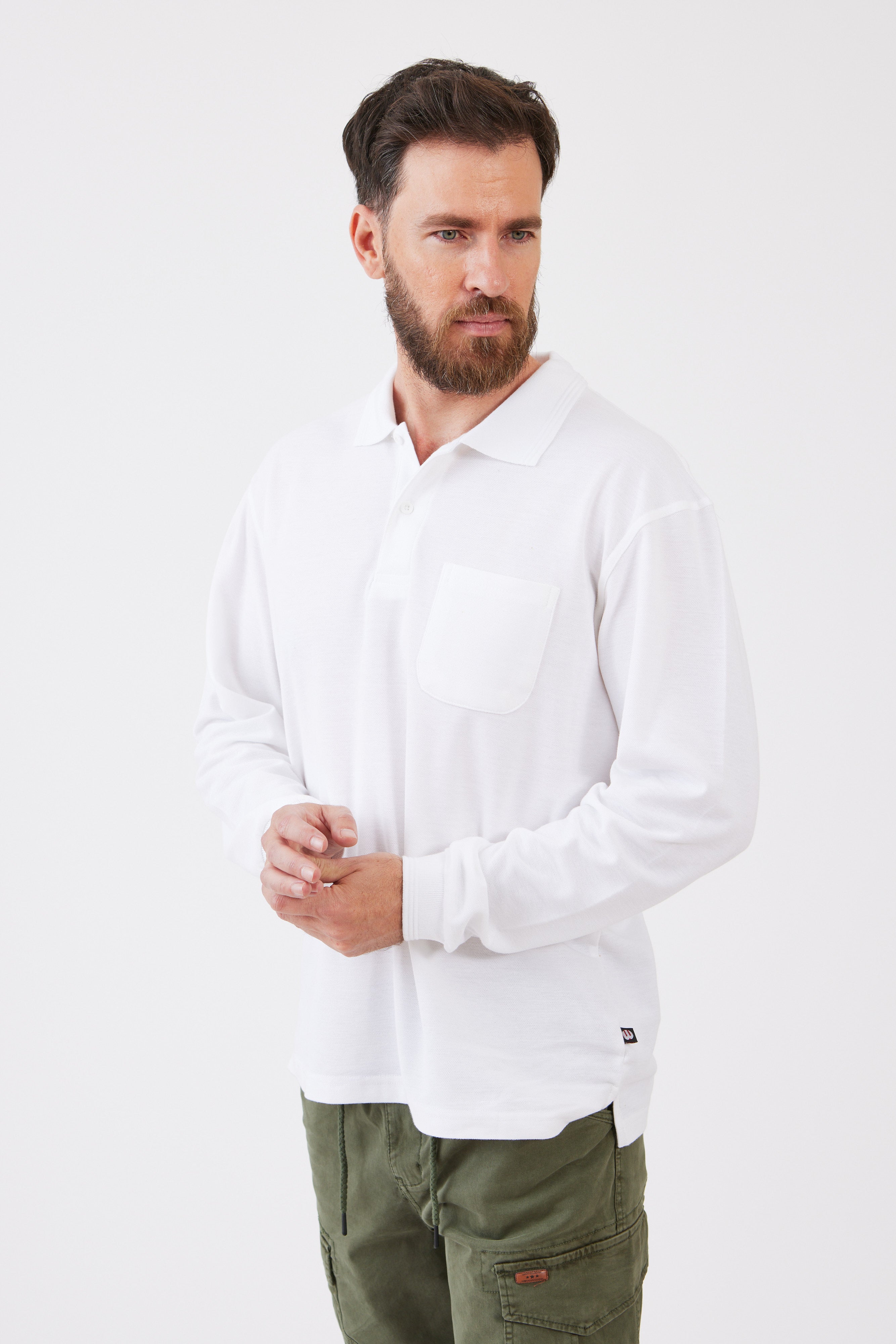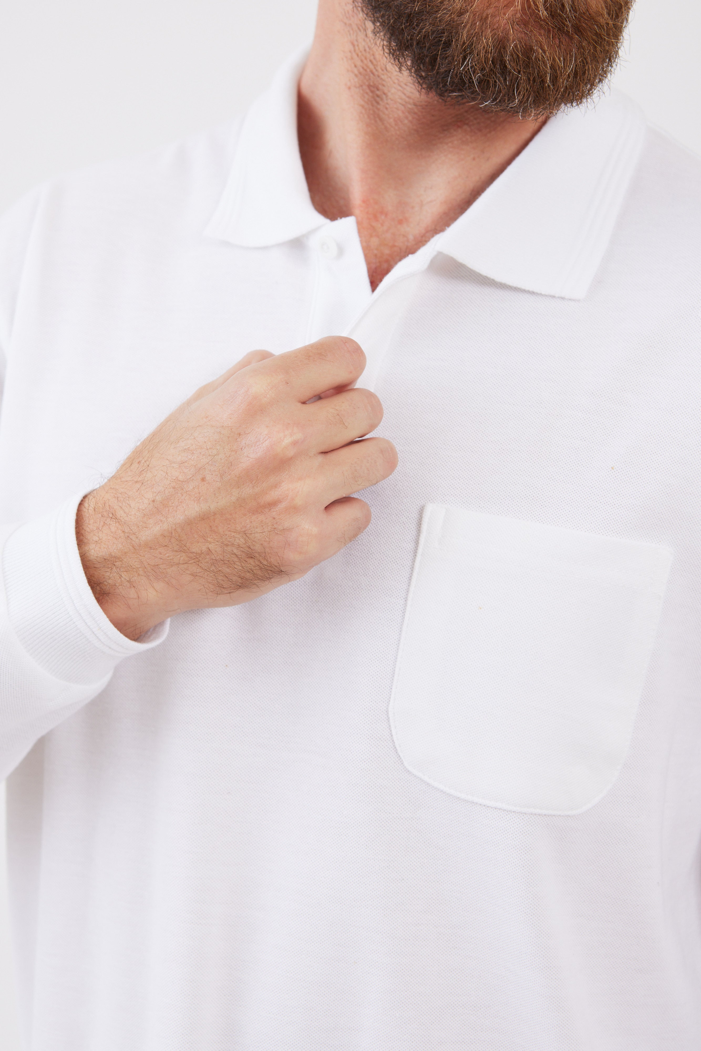 חולצת פולו שרוול ארוך עם כיס מידות גדולות - לבן