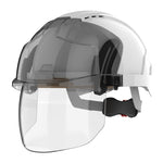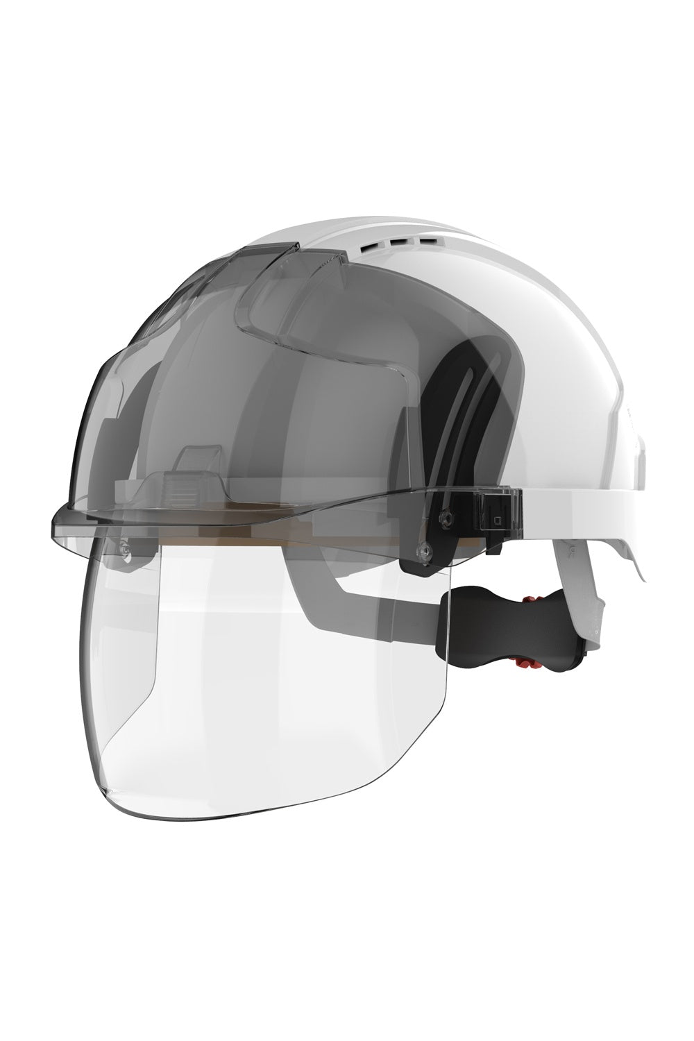 EN397:2012 EN50365 EN166 1 A K N קסדת המגן EVO VISTA SHIELD מהווה טכנולוגיה פורצת דרך המשלבת הגנת ראש ופנים במוצר אחד מגן הפנים בעל חוזק מכאני הגבוה ביותר -רמה A- מפני פגיעות של חלקיקים ושבבים העפים במהירות של 190 מ/ש וכן בעל ציפוי נגד אדים ושריטות. קל ונוח לשליפה ואחסנה בקסדה. ניתן לשלב מוצרים נוספים כגון משקפי מגן /מסכת חצי פנים/נשמיות/אוזניות מגן. קסדה עשויה פלסטיק ABS עמיד לחבטות וזעזועים, כולל ראצ'ט לכוונון והתאמה נוחים,6 נק עיגון. מגן פנים פוליקרבונט/99.9UV קסדה ABS
